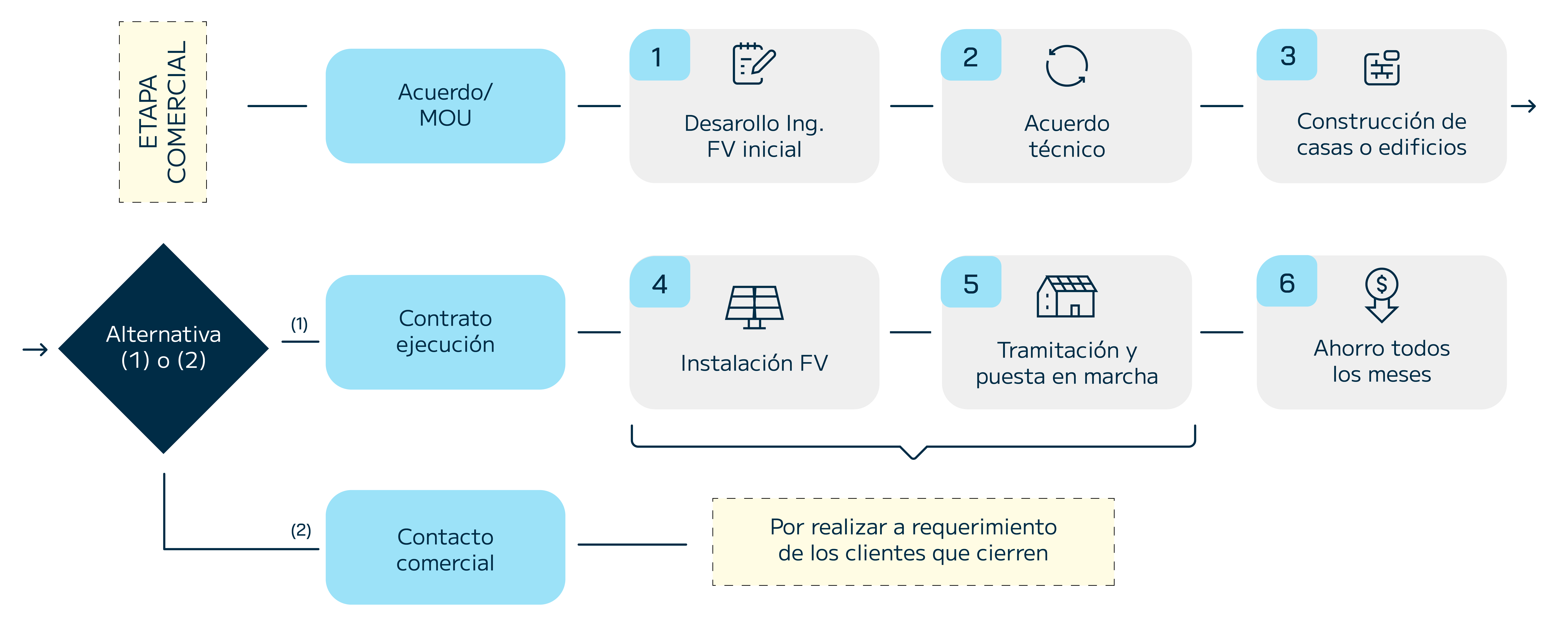 Una vez llegado a un acuerdo y cumpliendo las etapas iniciales del trabajo (Desarrollo de Ingeniería FV inicial, Acuerdo técnico, Construcción de casas o edificios), contamos con dos alternativas comerciales para financiar sistemas FV en tu proyecto inmobiliario.